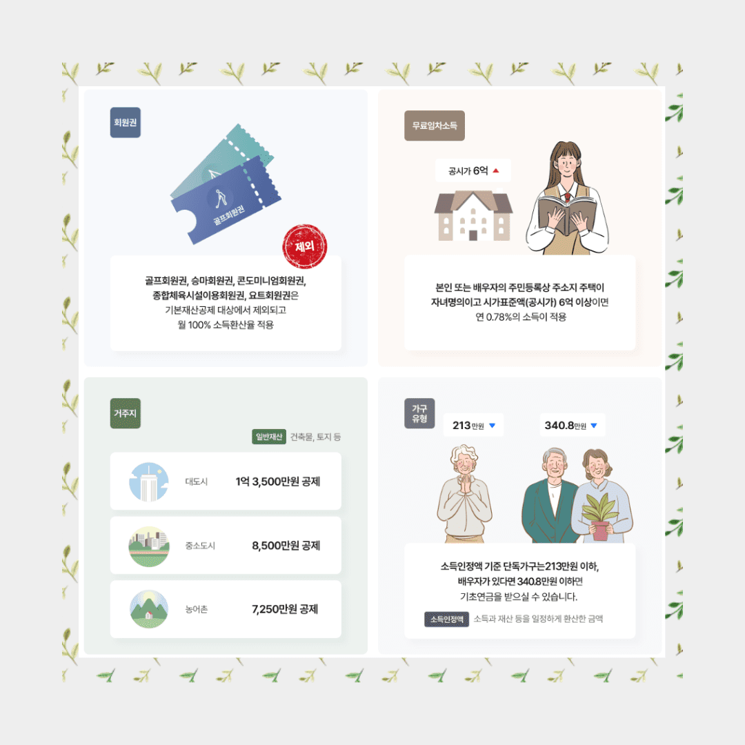 또한, 소득인정액이 정부가 정한 기준액 이하여야 합니다. 2024년 기준으로 단독가구는 월 217만원, 부부가구는 월 347.2만원입니다. 이 기준은 매년 조정되므로 최신 정보를 확인하는 것이 중요합니다.