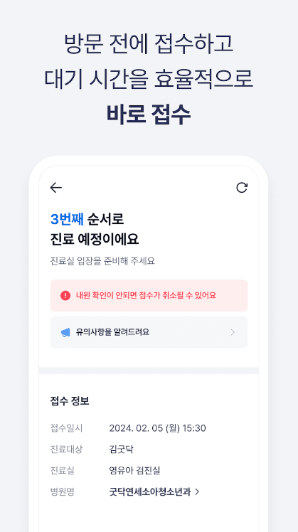 - 병원 가기 전 바로 접수 : 진료 순번을 확인해서 차례가 올때 병원에 방문할 수 있습니다.