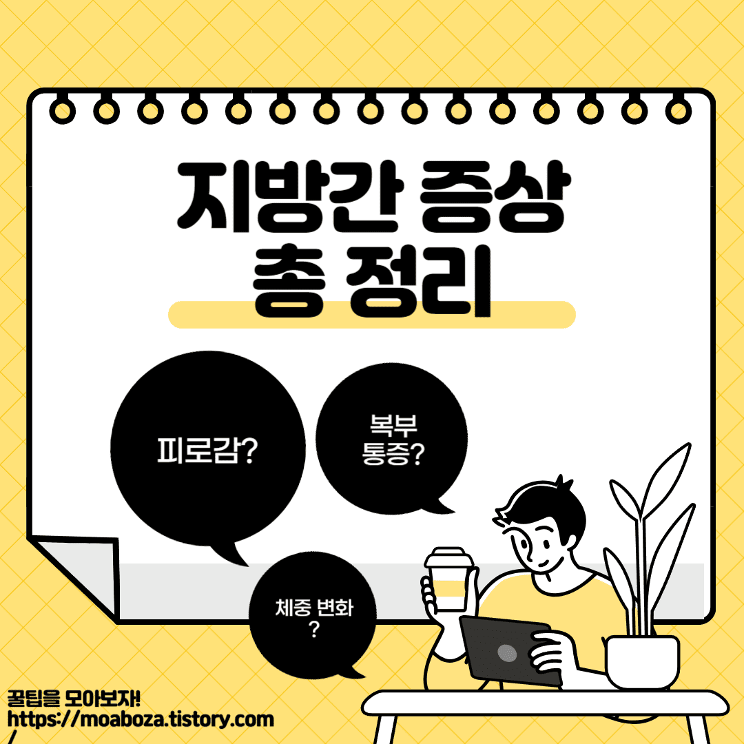 - 일상적인 활동이 예전보다 힘들게 느껴지거나, 오후에 심한 졸음을 느낀다면 지방간 증상을 주의 깊게 살펴봐야 합니다.