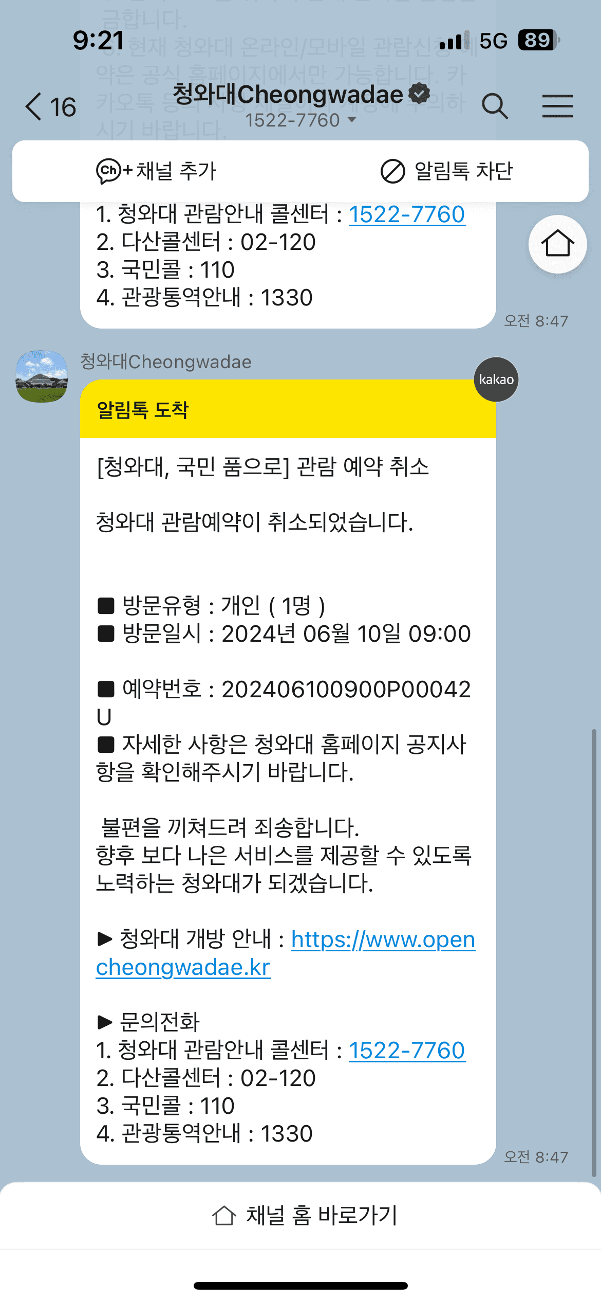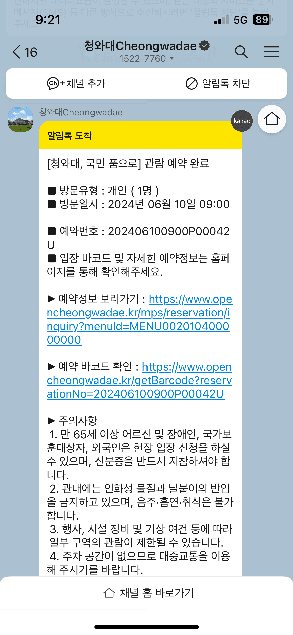 6) 청와대 카카오톡의 예약 내역 메세지 확인