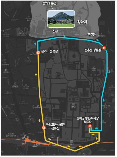 경복궁 동편 주차장 국립고궁박물관 청와대 정류장 춘추문 정류장 |